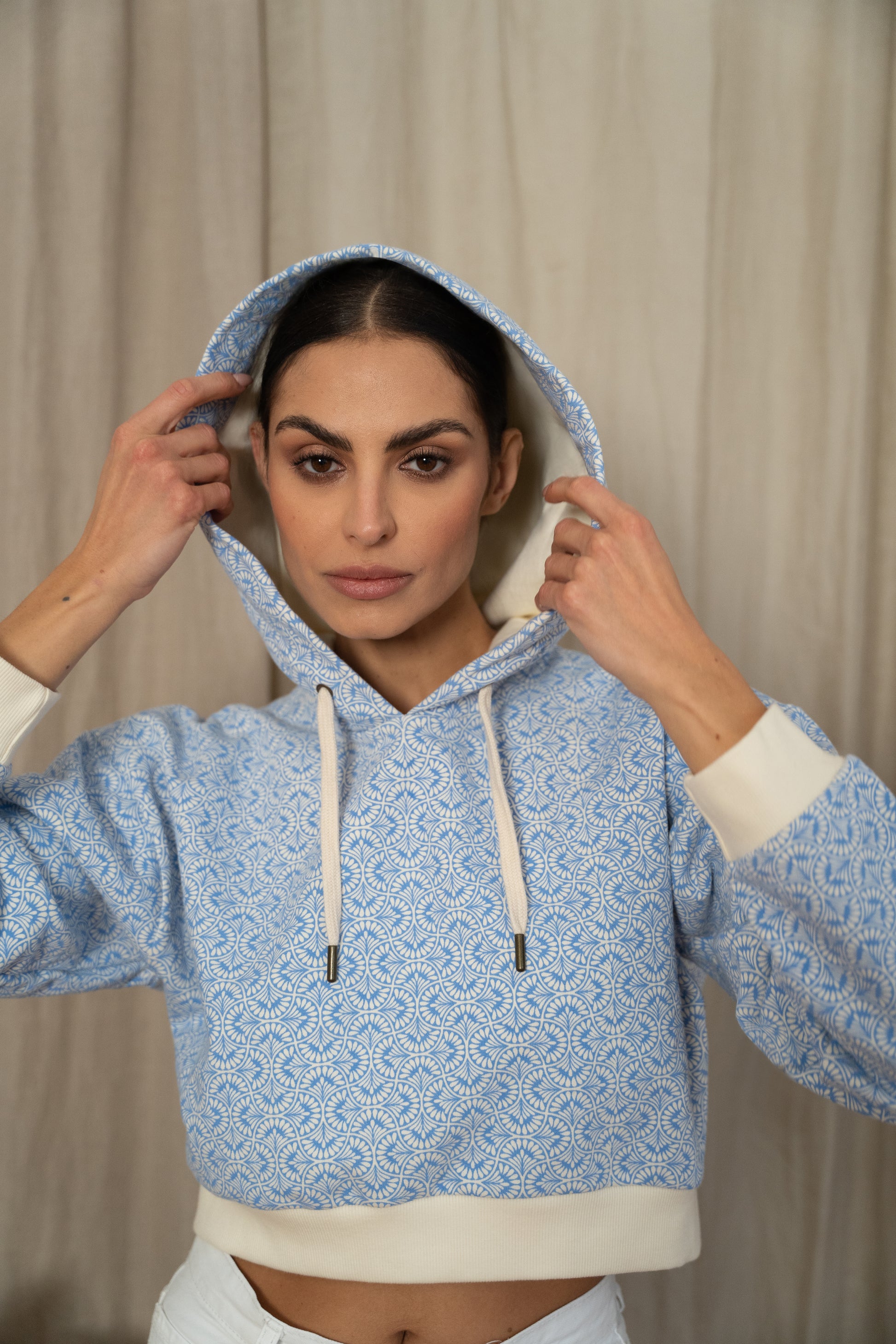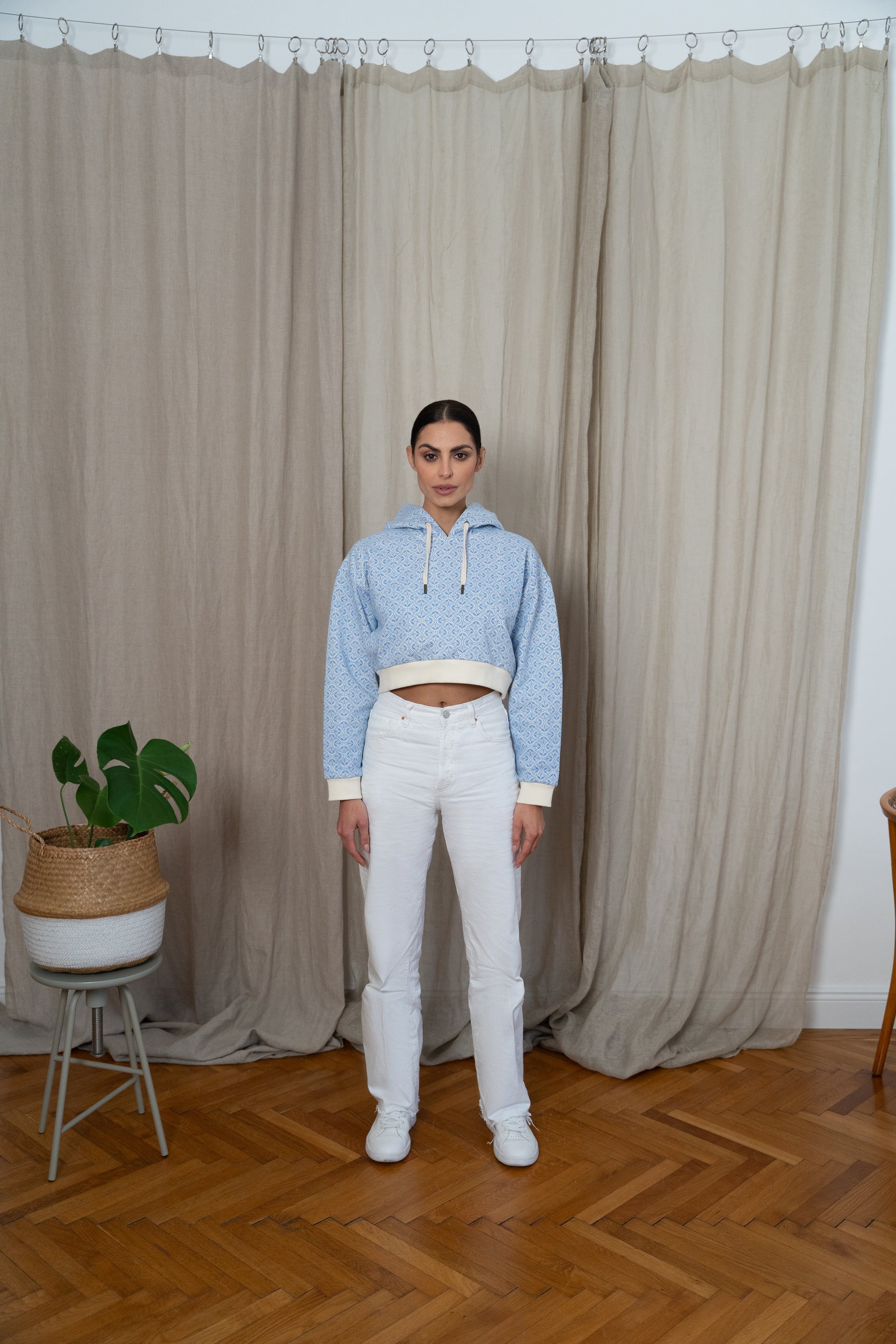 Organic Cotton Hoodie, Easy fit, cropped waist with ample hood. Hand block printed. Made in the EU.