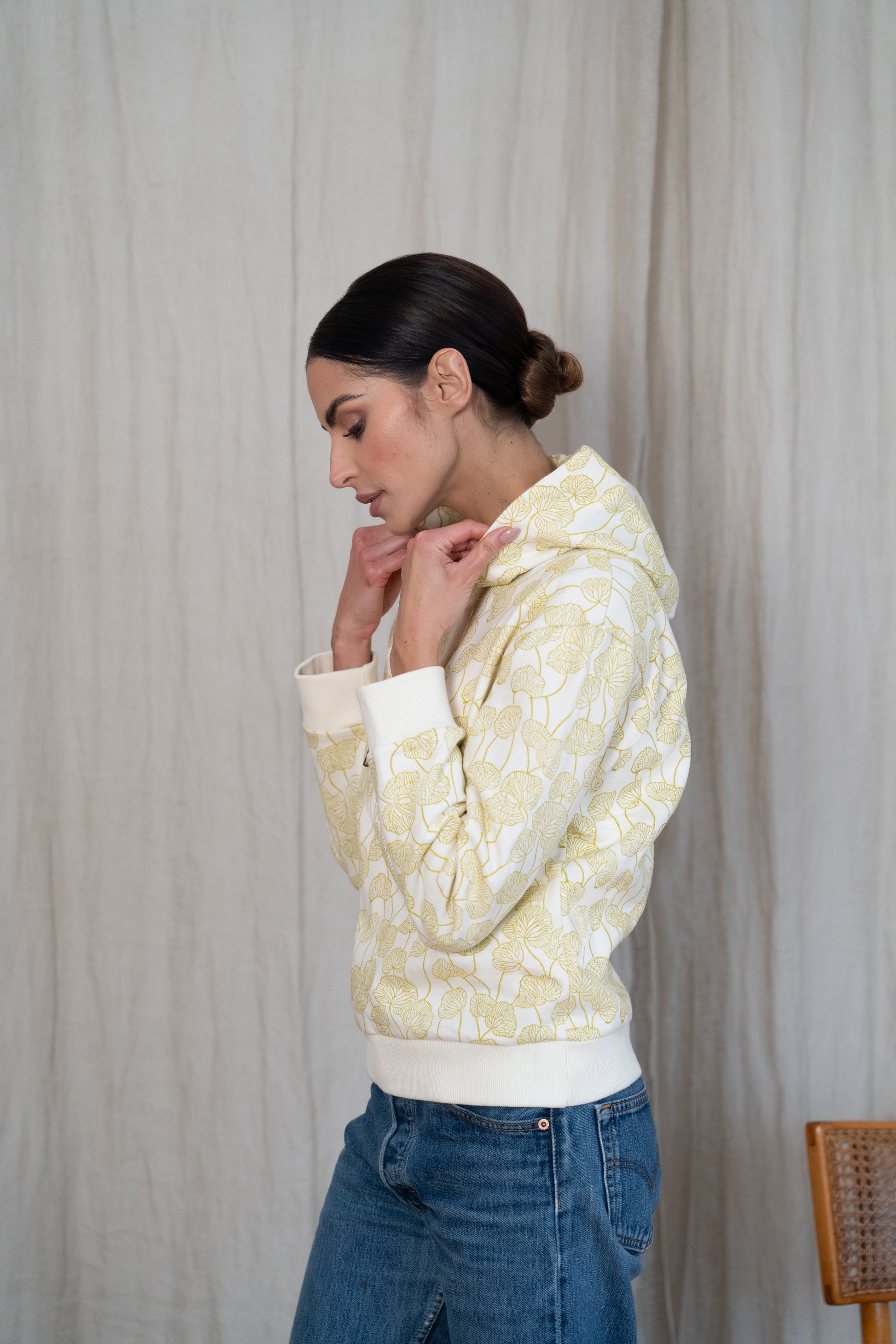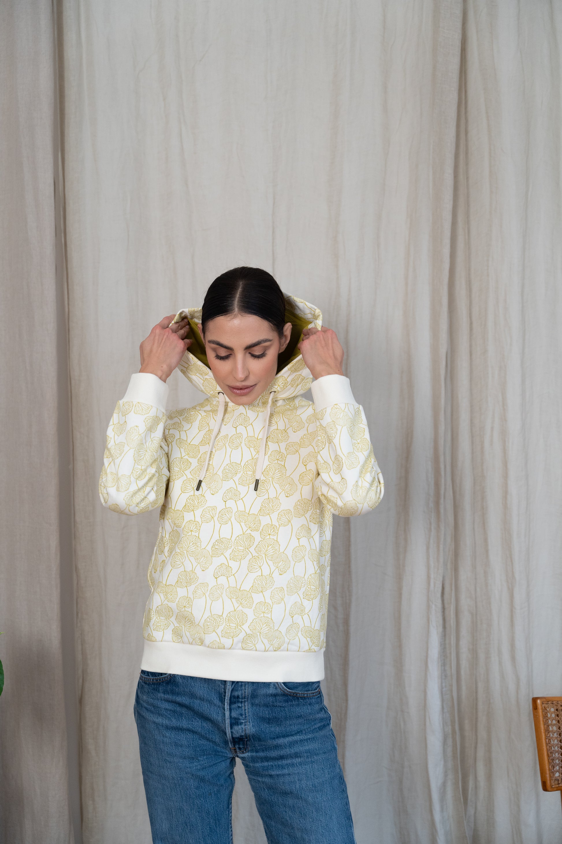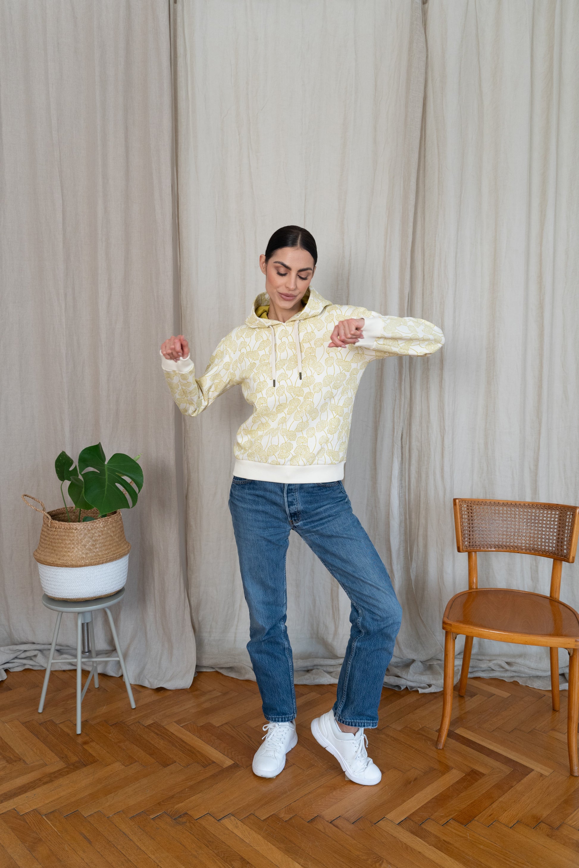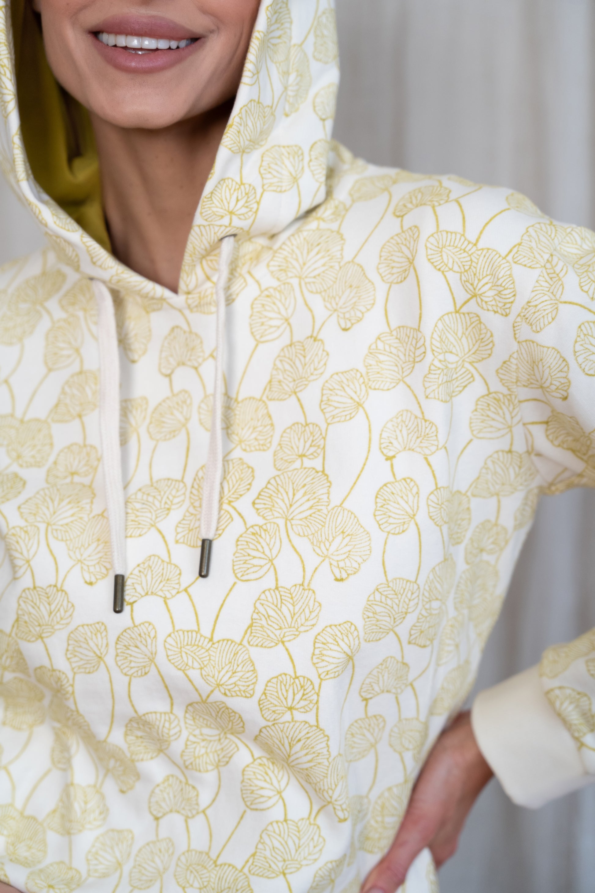 Organic Cotton Hoodie, regular length with ample hood. Hand block printed. Made in the EU.