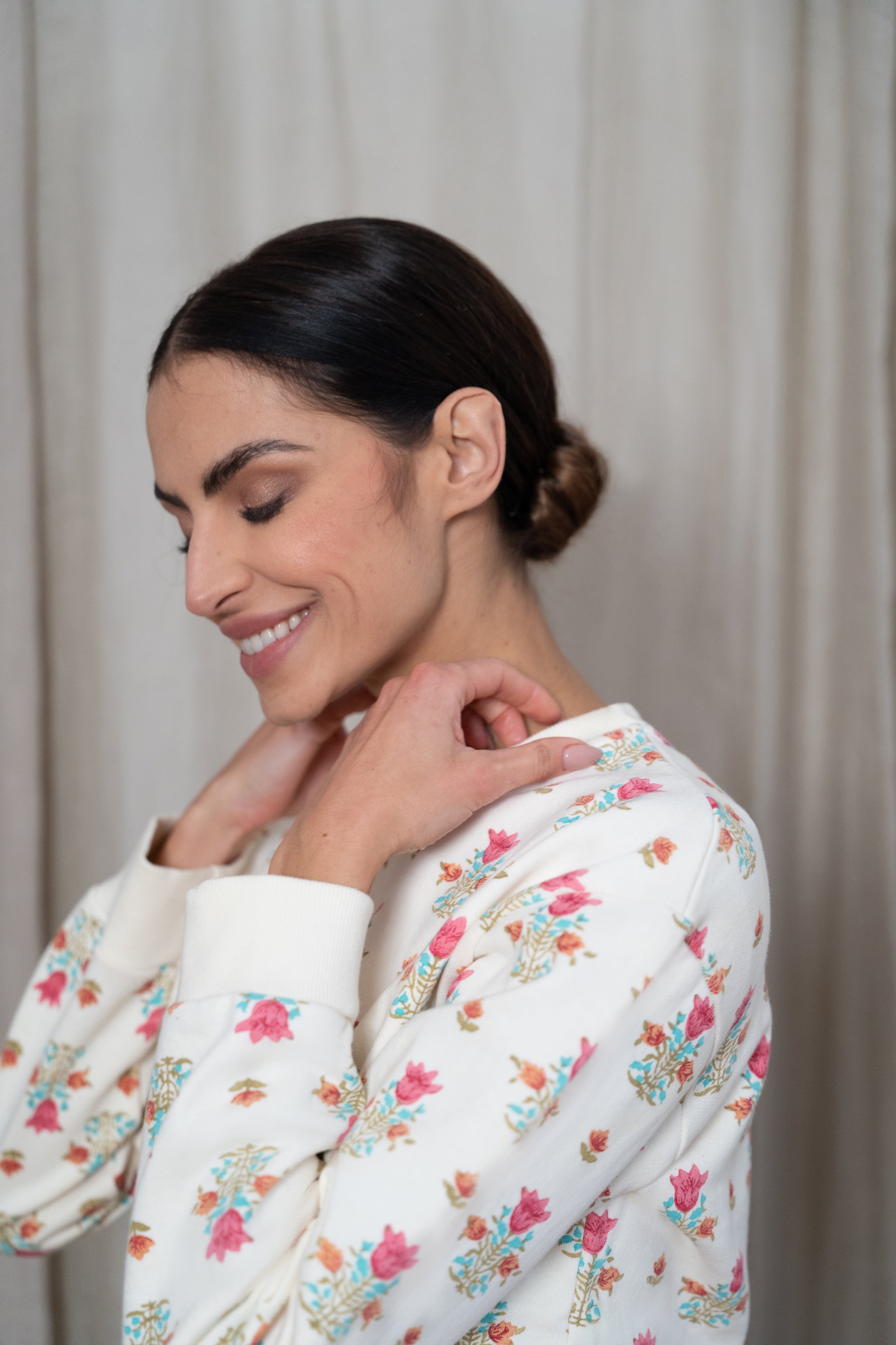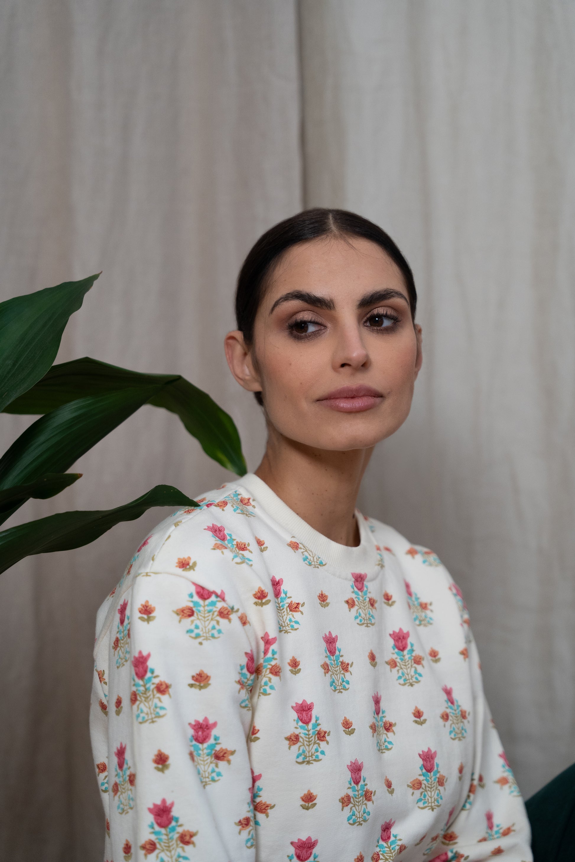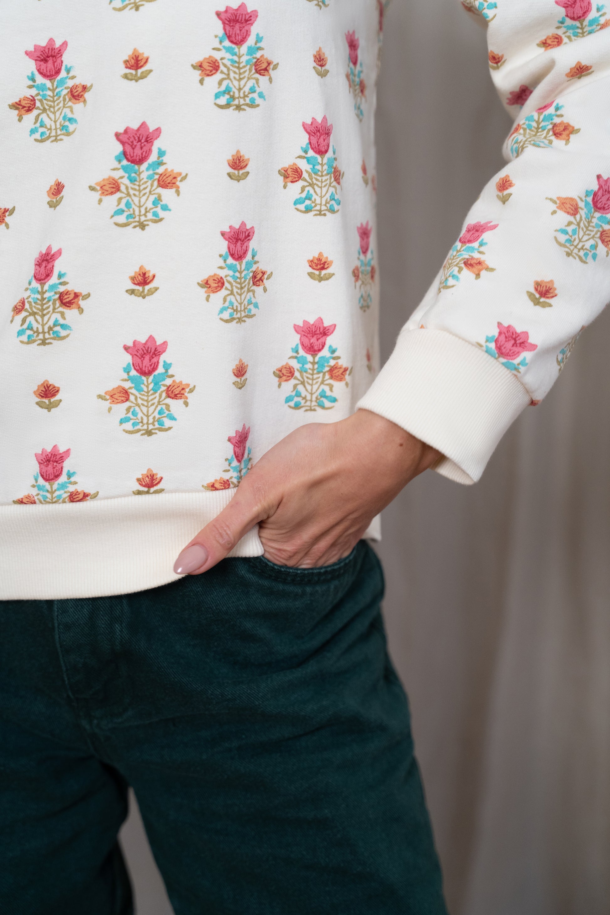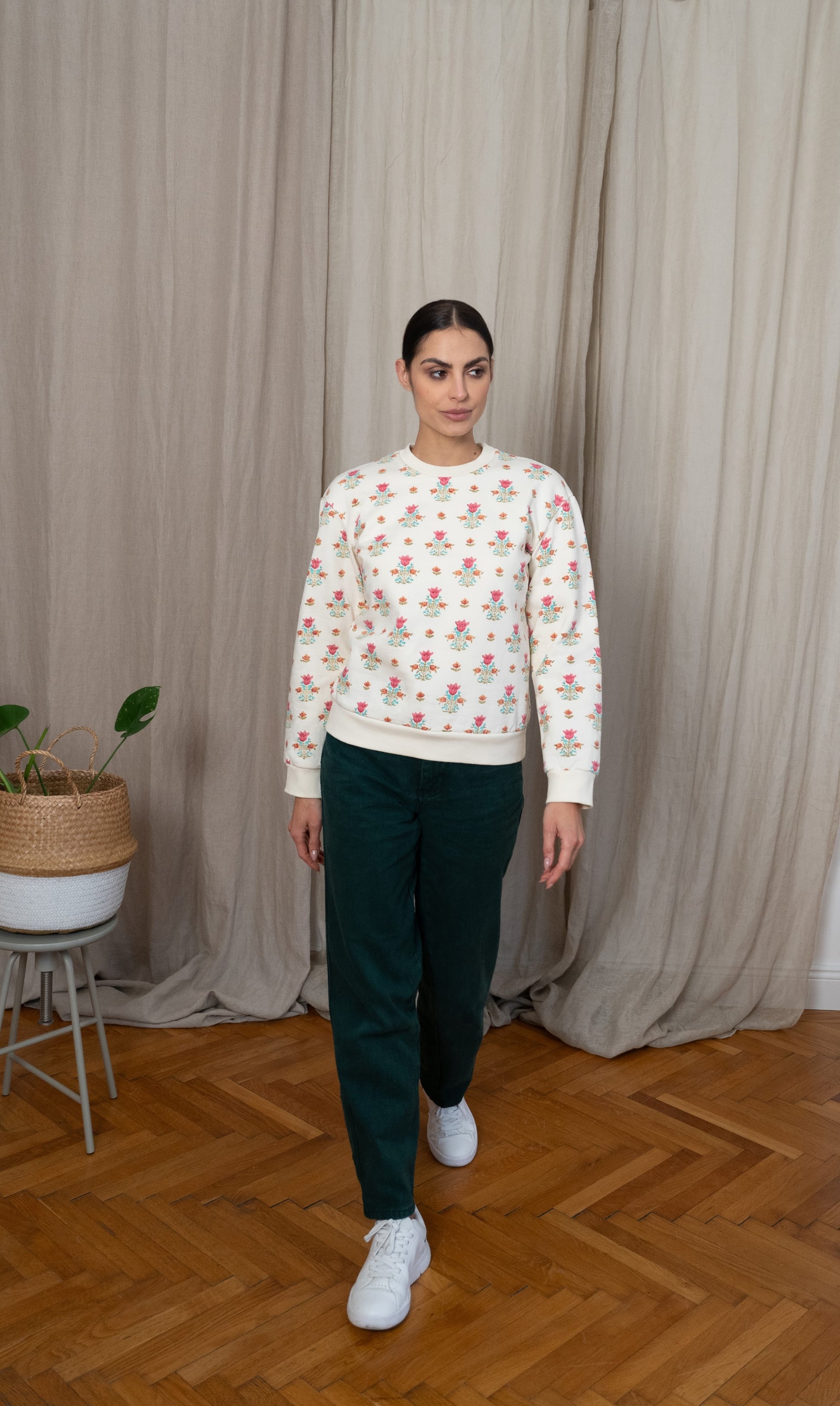 Organic Cotton sweatshirt, crew neck, regular length. Hand block printed. Made in the EU.